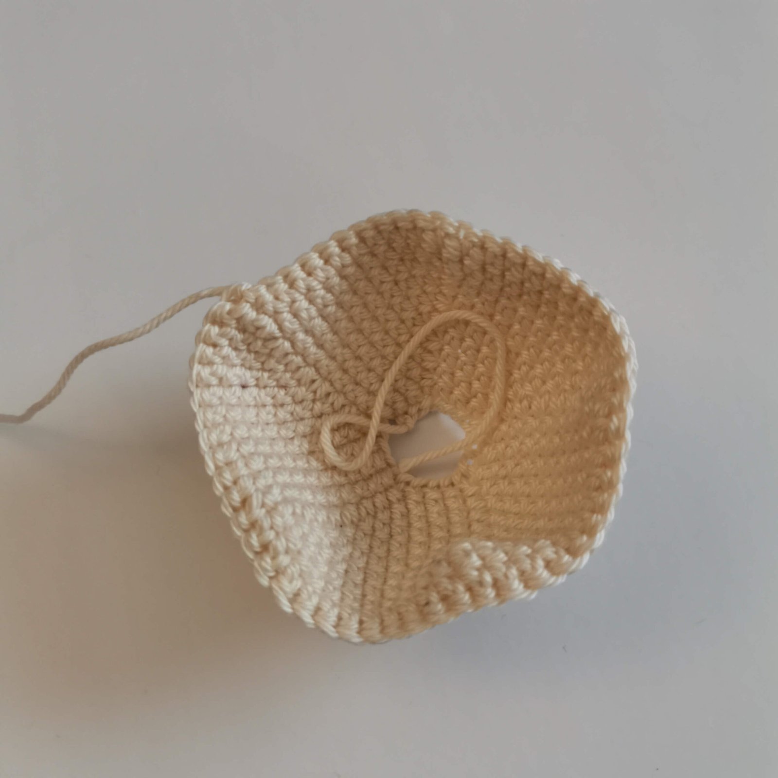 The bottom part starts on the first row of the top part, creating the base of the donut. Make sure that the parts are facing you with the right side out. The top and bottom should face each other on the wrong side. If it is easier for you, you can make the parts separately and sew them together at the end.
