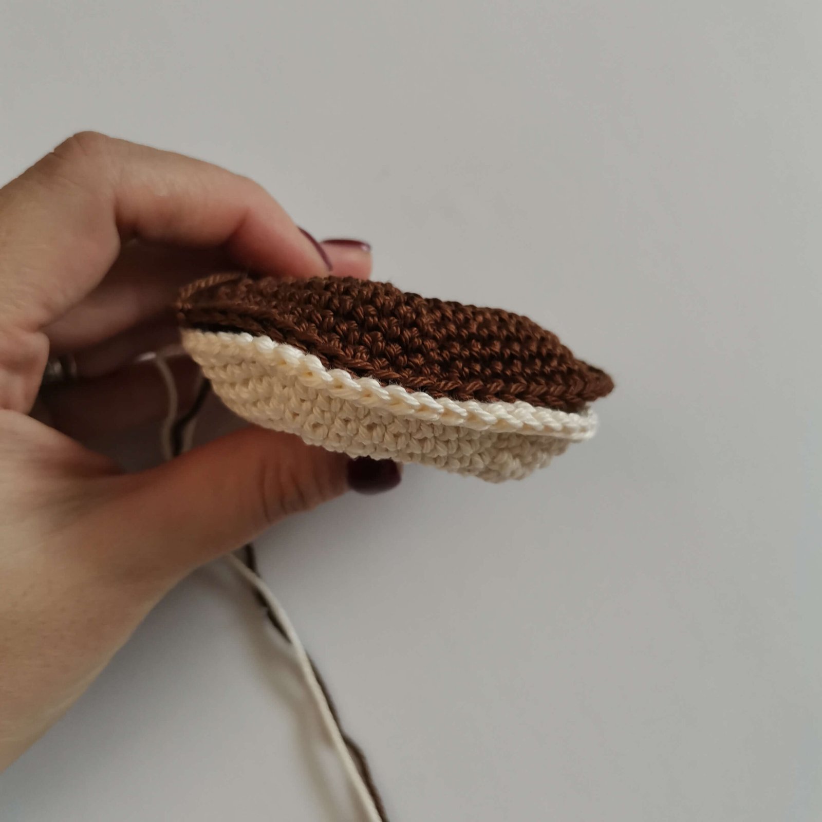 • Sewing: Place the top and bottom parts so their wrong sides are facing each other. Sew them together using the back loops only of the top part and both loops of the bottom part. Stuff the donut firmly as you go.