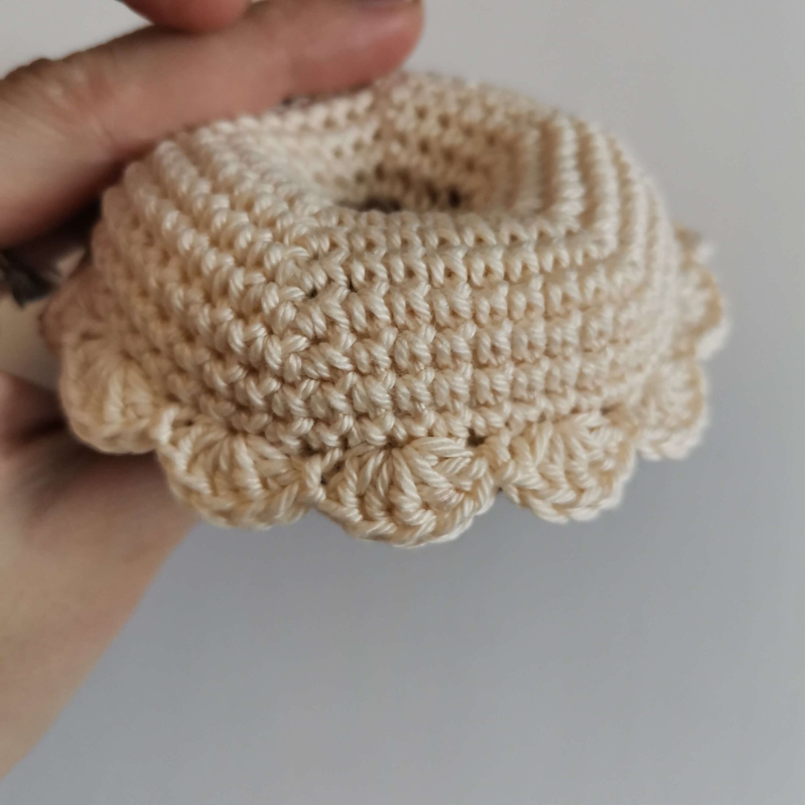 • Icing Detail (The Scalloped Edge): Attach Color B with a slip stitch to the remaining front loops of the top part.