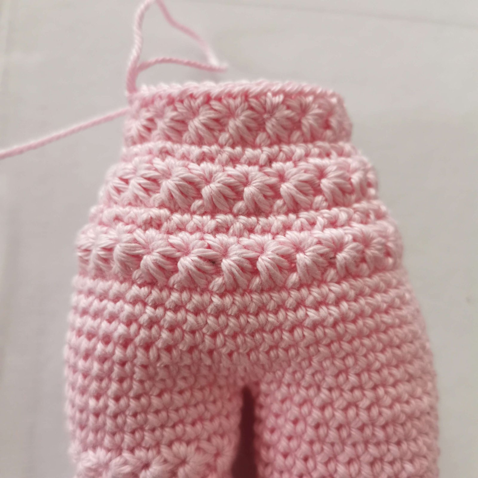 Attach pink yarn to the front of the onesie, chain to the back, sl st, and chain back to the front to make suspenders.