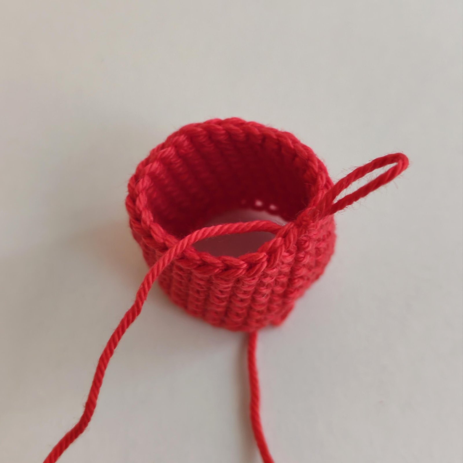 The base is worked in joined rounds to create a tall cylinder that will be folded for extra thickness.