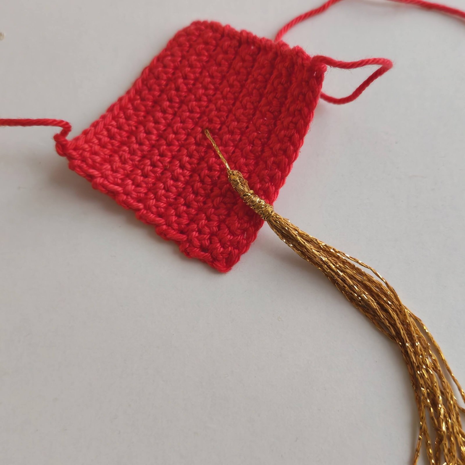 - The Tassel: Create a tassel using gold (or black) yarn. Secure the tassel to the center of the second Top Part square.