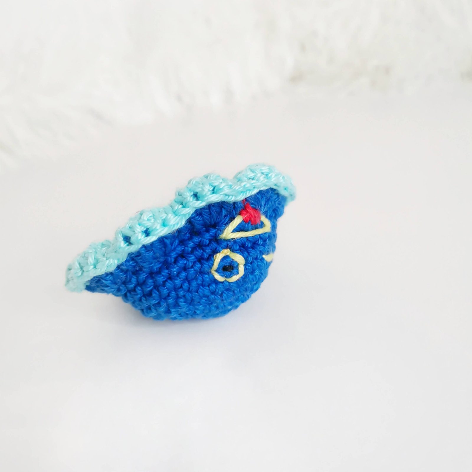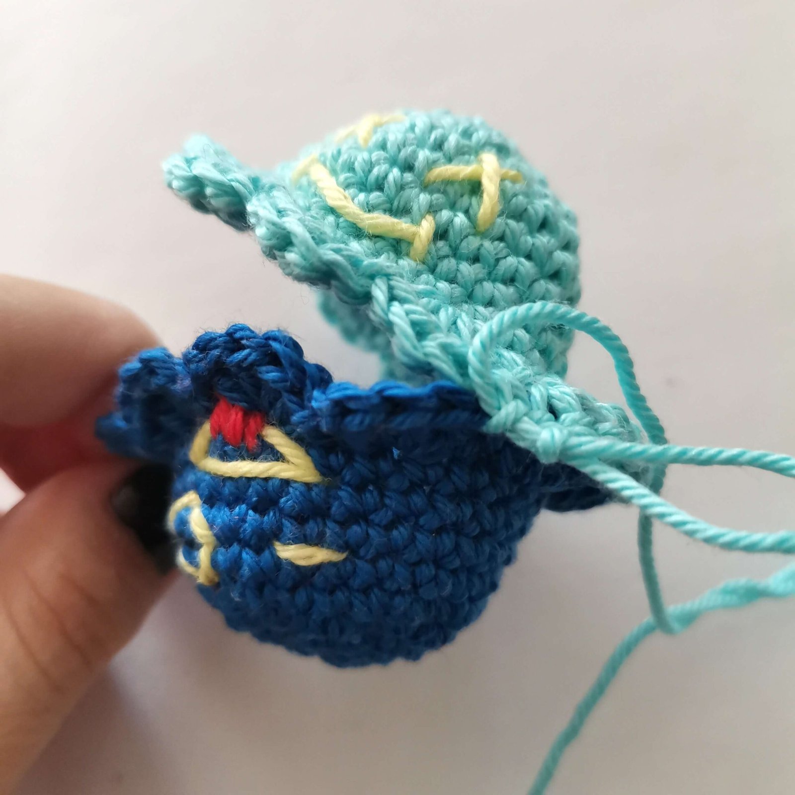 - Embrace the Character: Before joining the pieces, embroider the facial features on both parts. Use your yellow, red, and black yarn to create a happy face on one side and a “moody” or winking face on the other.
