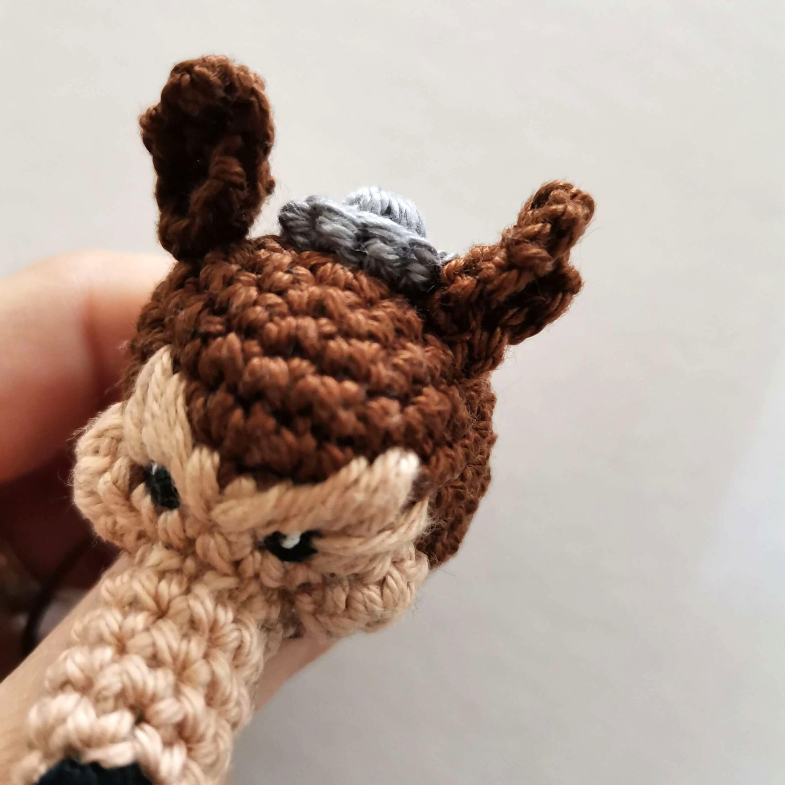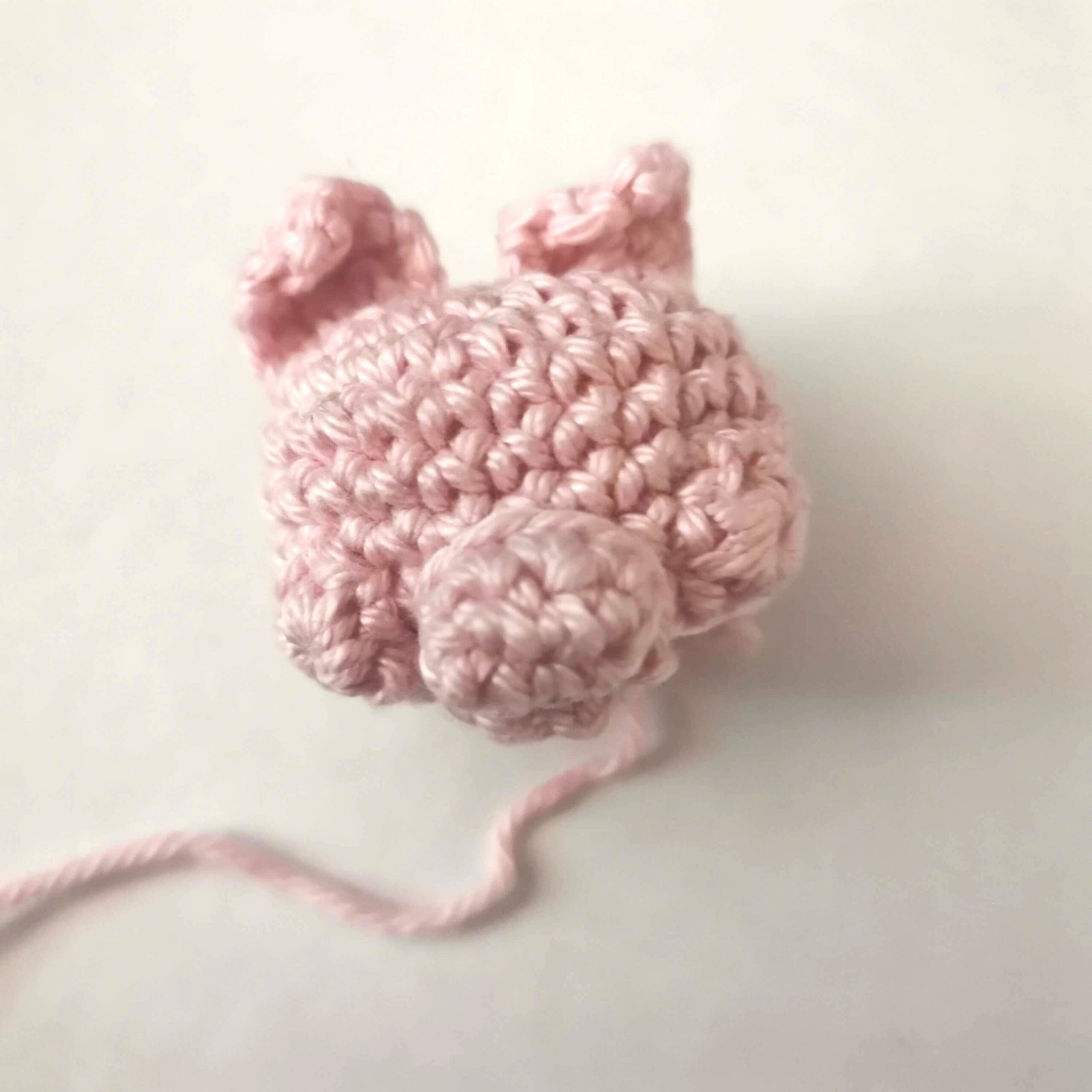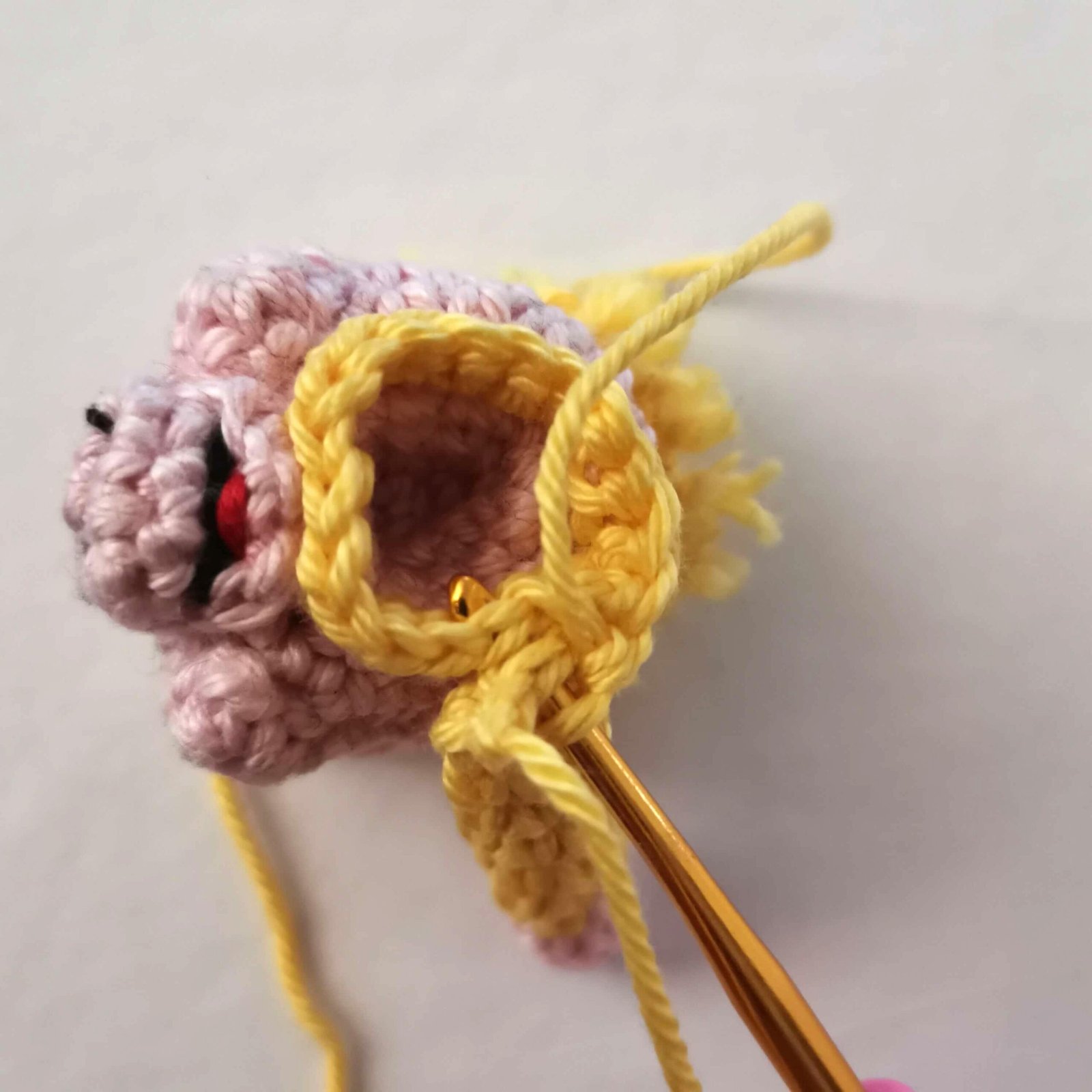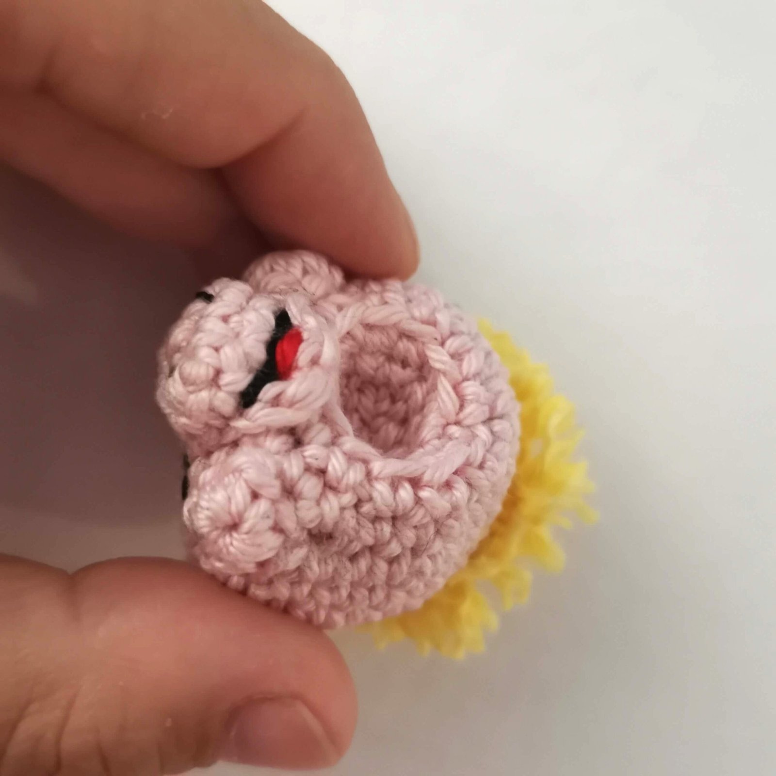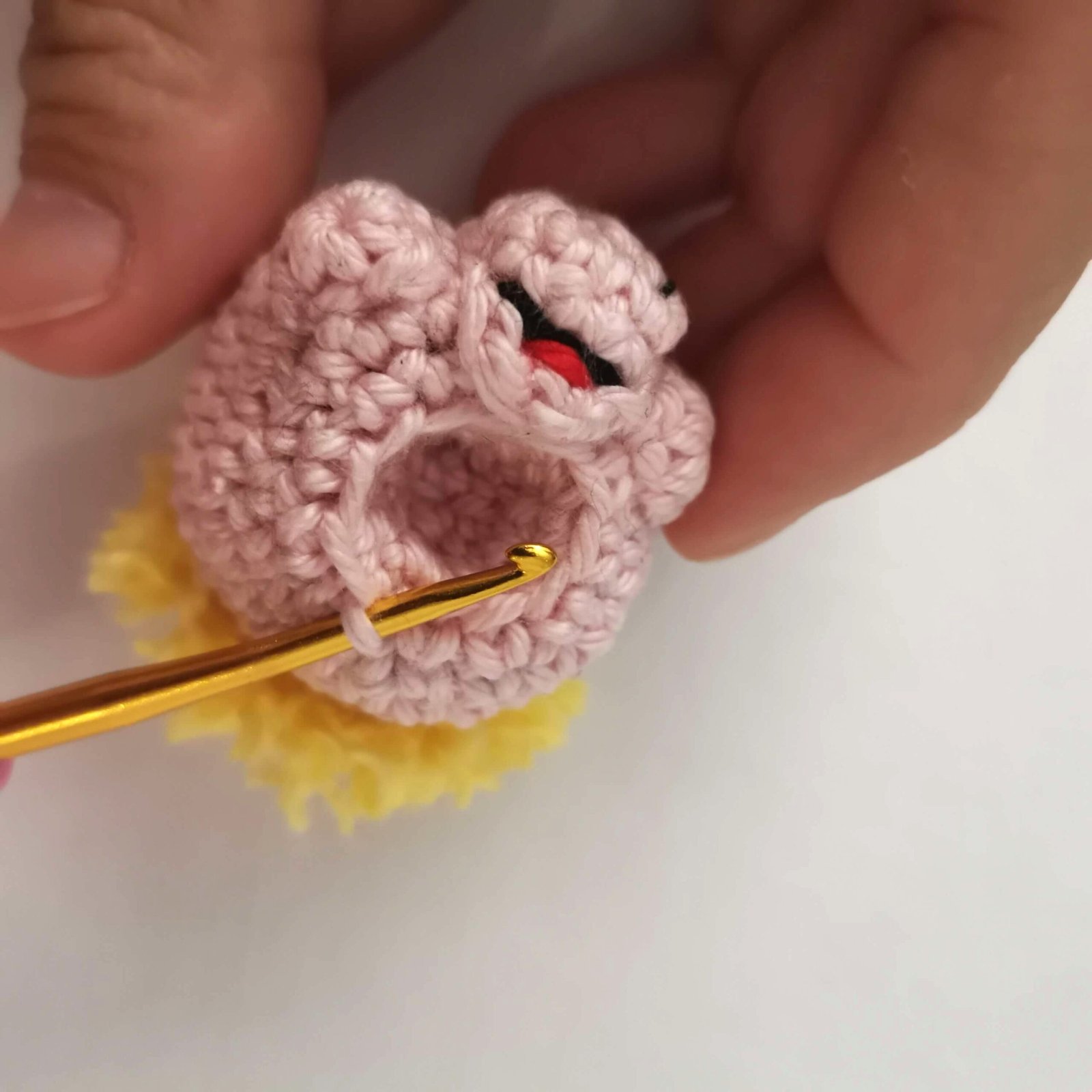 Without fastening off, stop here to add the facial features. We will continue crocheting the head after that.