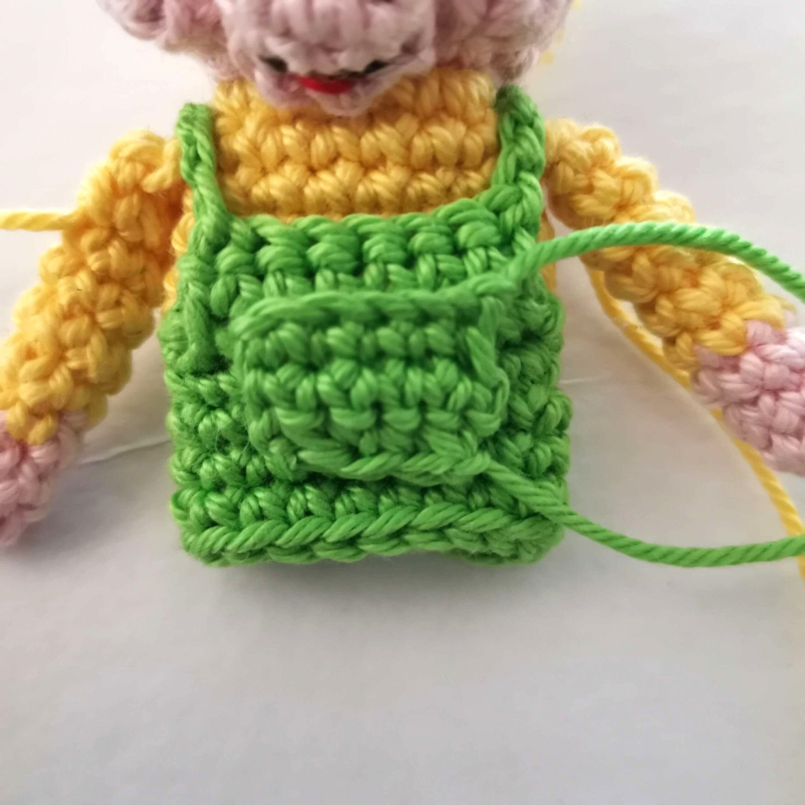 Bib: Attach green yarn to the front of Round 16.