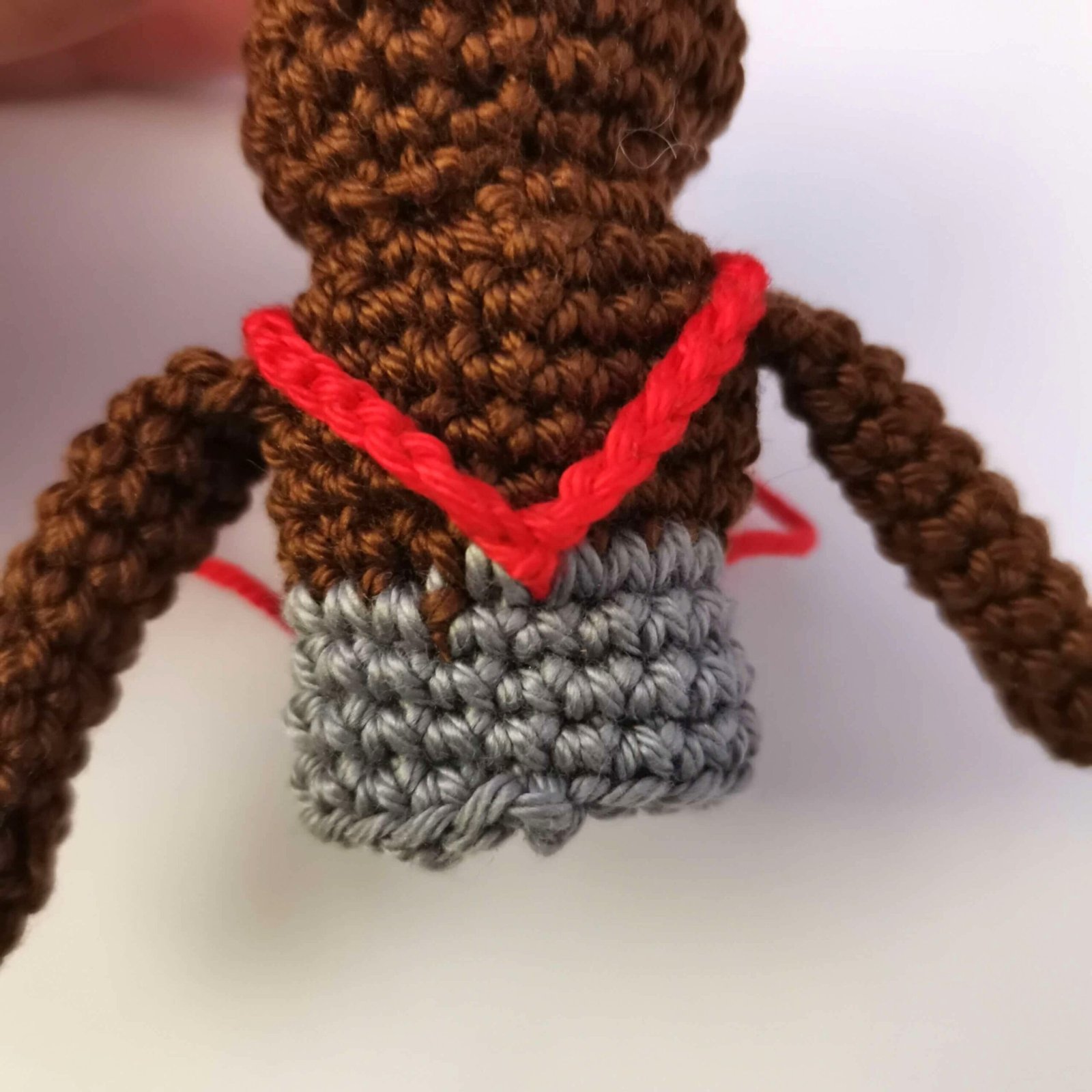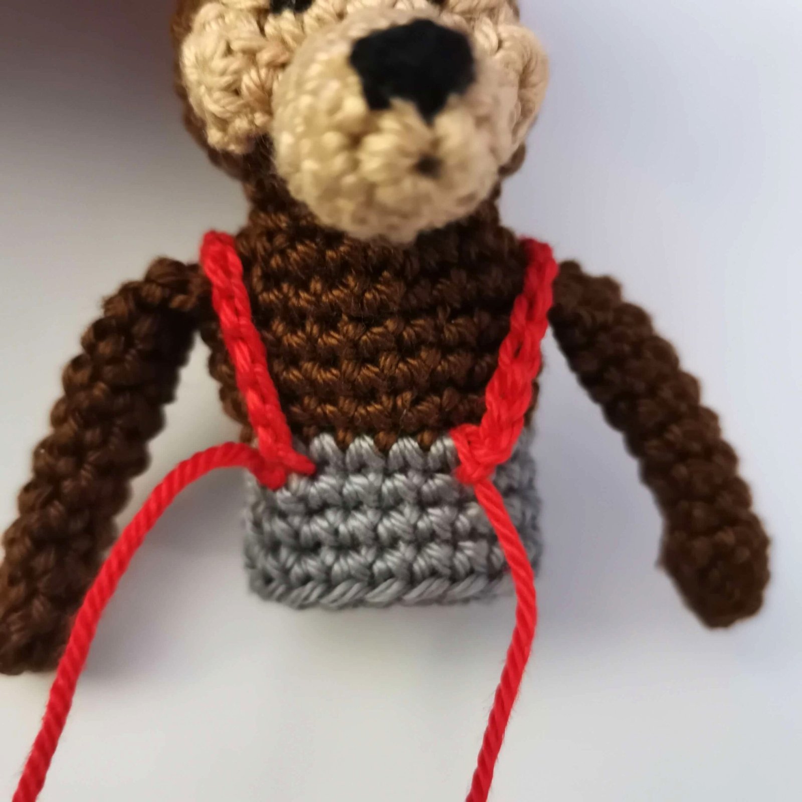 Suspenders: Attach Red yarn to the front of the pants. Ch 16, sl st to the back of the pants, then ch 16 and sl st back to the front to create the X-shape.